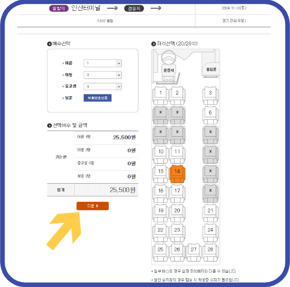 3. 매수와 좌석을 지정하고 금액확인 후 다음 버튼을 클릭합니다.