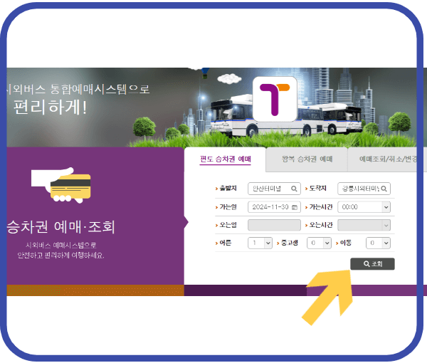 1. 시외버스통합예매시스템 홈페이지 접속 후 메인 화면 중앙의 승차권 예매 박스에서 출발지, 도착지 , 가는일,가는시간, 매수를 정하고 조회버튼을 눌러줍니다.
