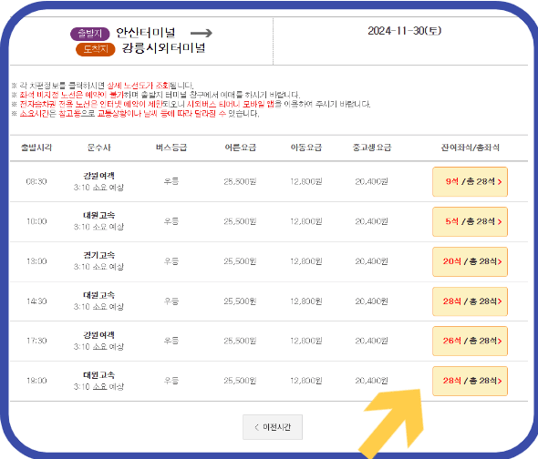 2. 배차조회를 보고 잔여석 확인 후 원하는 시간 잔여석 버튼을 클릭합니다.