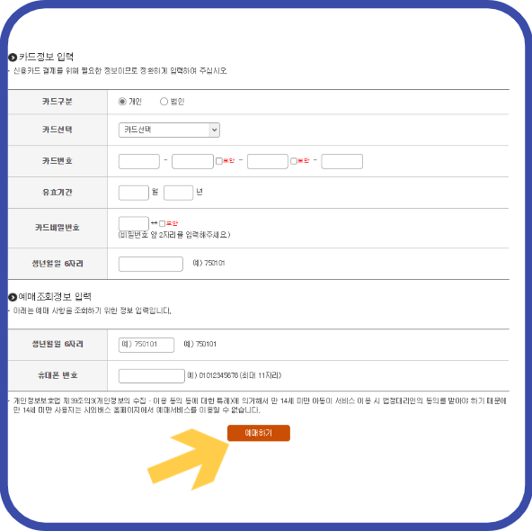5. 카드정보를 정확히 기재하고 예매하기버튼을 클릭하며 예매완료가 됩니다.