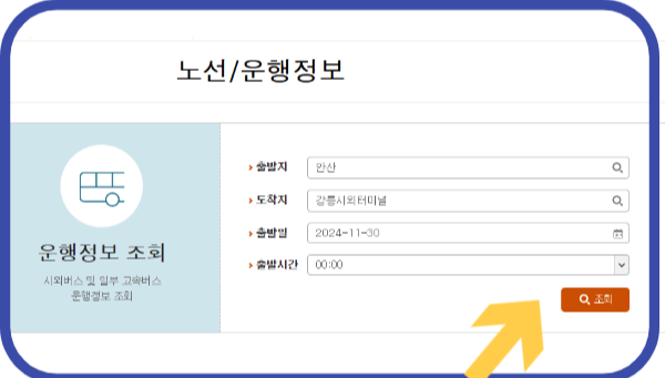 2. 출발지에는 안산, 도착지, 출발일, 출발시간등을 적용하고 하단 조회 버튼을 눌러줍니다.