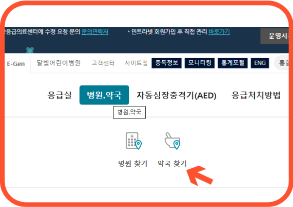 1. 먼저 응급의료포털 홈페이지를 접속하고 상단 메뉴에서 병원,약국 중 약국찾기를 클릭합니다.