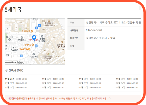 3. 심야에도 운영하는 약국이 있는지 검색 후 약국이름을 클릭하면 상세 정보가 조회됩니다