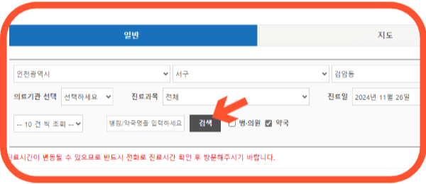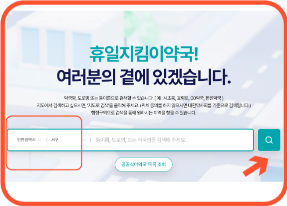 1. 휴일지킴이약국 홈페이지에 접속해서 인천광역시, 서구를 지정해 검색 버튼을 클릭합니다.