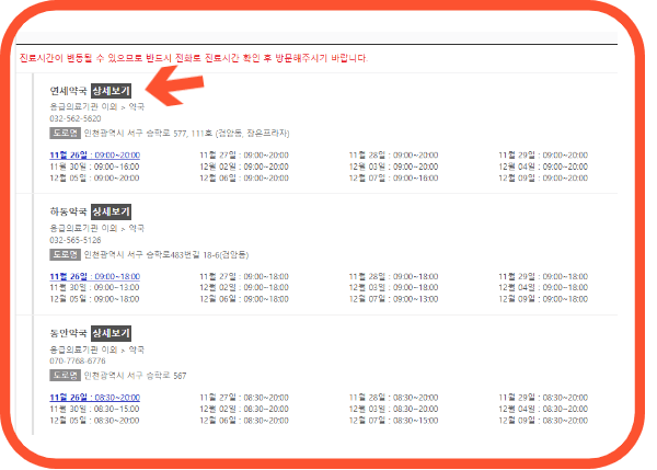 3. 약국이 조회되면 상세보기 버튼을 클릭합니다.