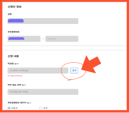 4. 신청인정보를 확인하고 신청내용에서 학교를 검색합니다.