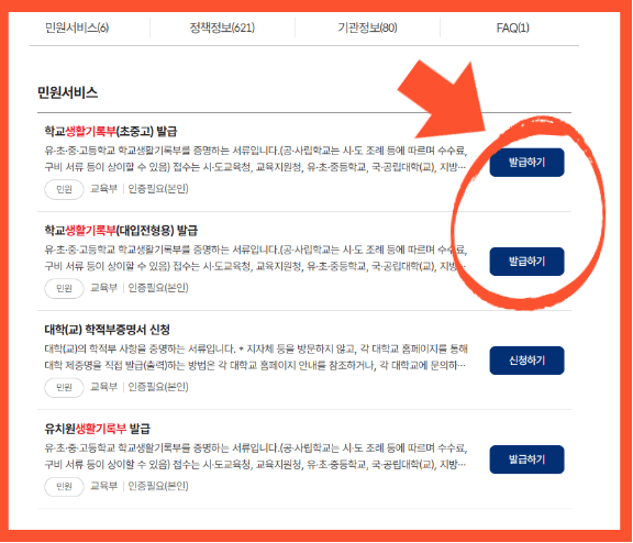 3. 민원서비스에서 학생기록부 발급하기 (초중고, 대입전형용 중 선택) 버튼을 클릭해줍니다.